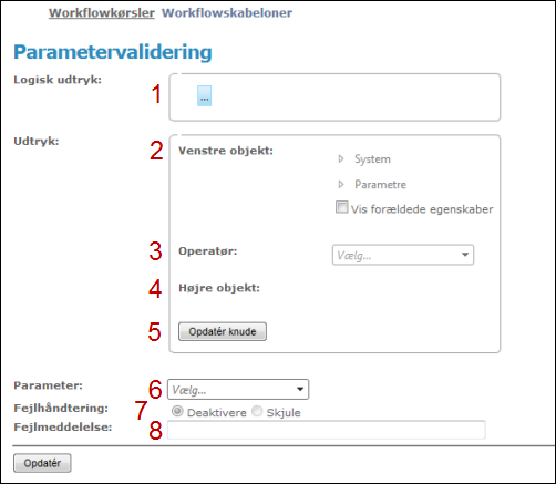 | 6. | Parameter angiver det punkt i Start Workflow-guiden, hvor valideringen udføres. Valideringen udføres ved angivelse af den her valgte parameter samt umiddelbart før opstart af workflowet. Hvis der ikke er angivet en parameter, valideres der allerede inden første parameter udfyldes. Dette bruges til at validere egenskaber om systemparametrene – f.eks. kan man tjekke, om der er tilsluttet en til den udførende bruger.![]() |