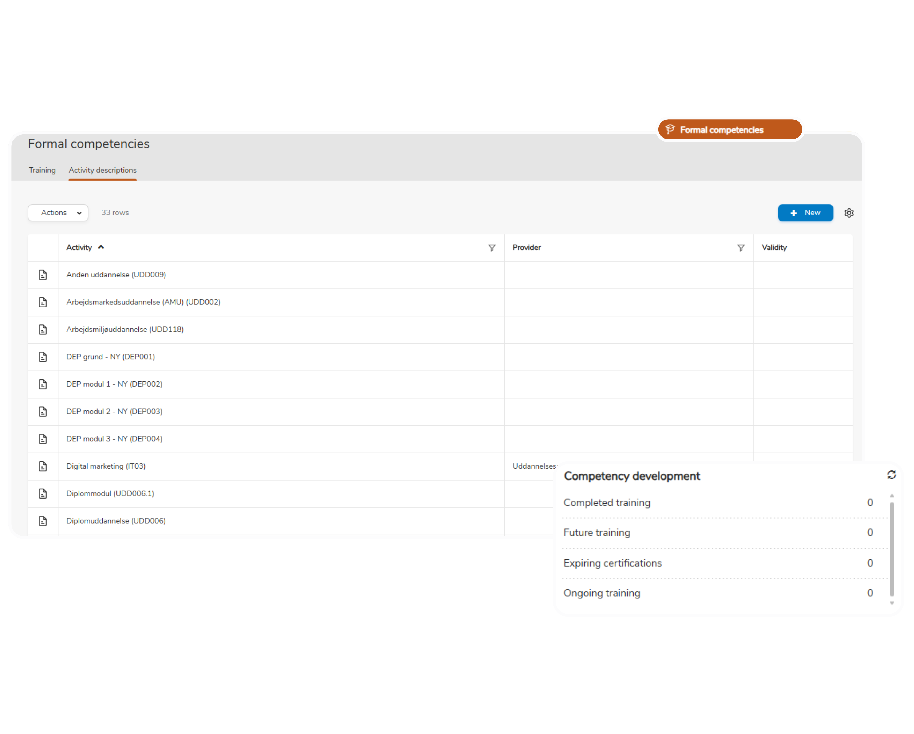 When hiring a new employee, formal competencies can be registered and the acquisition of missing courses and programs is planned.