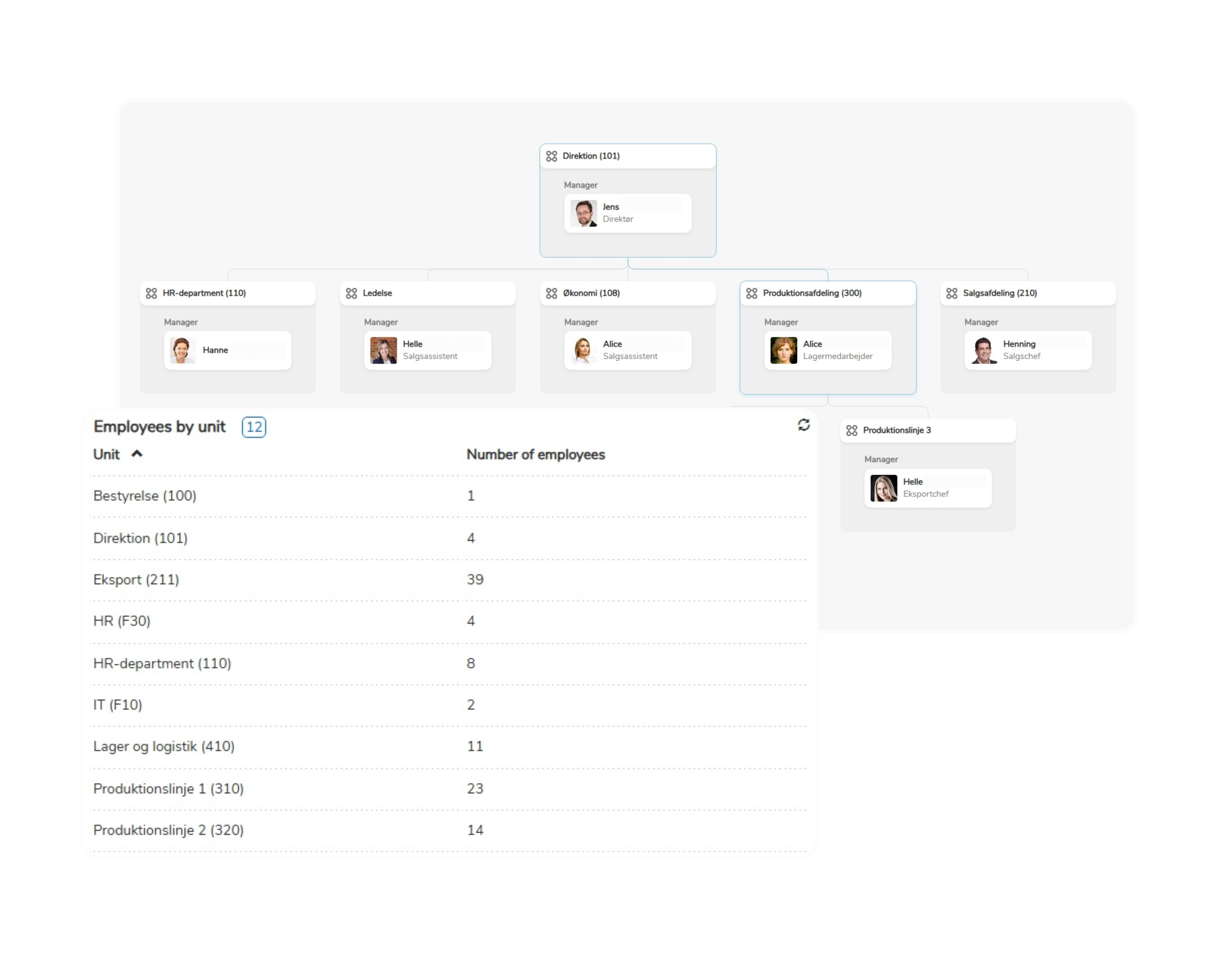 Keep track of units, employees, and managers, and get a full overview with a dynamic organizational chart.